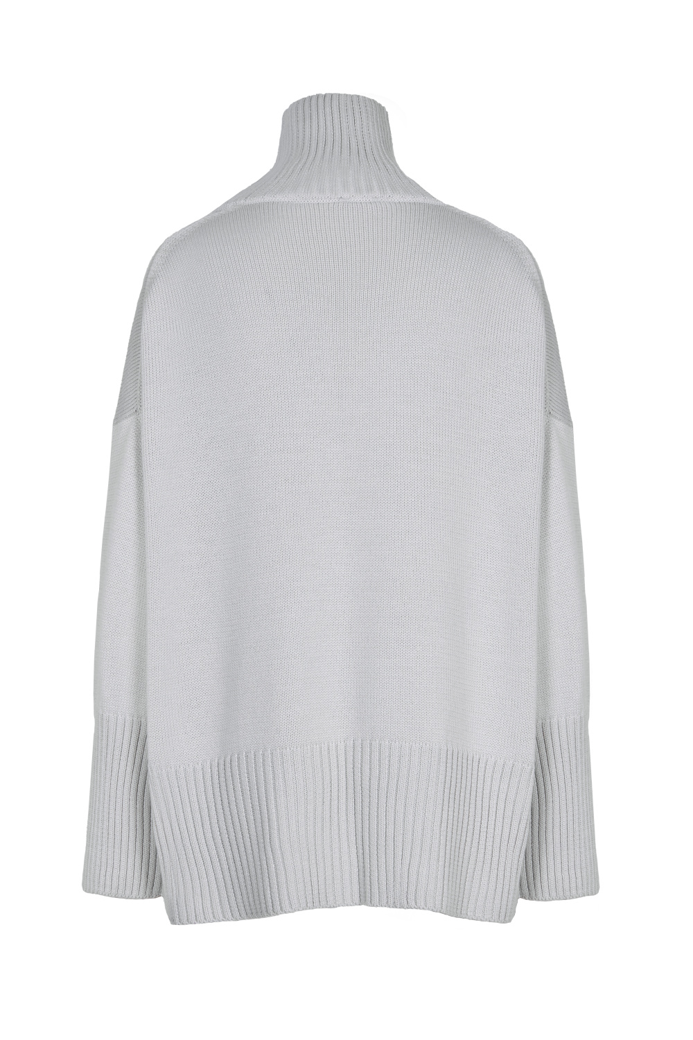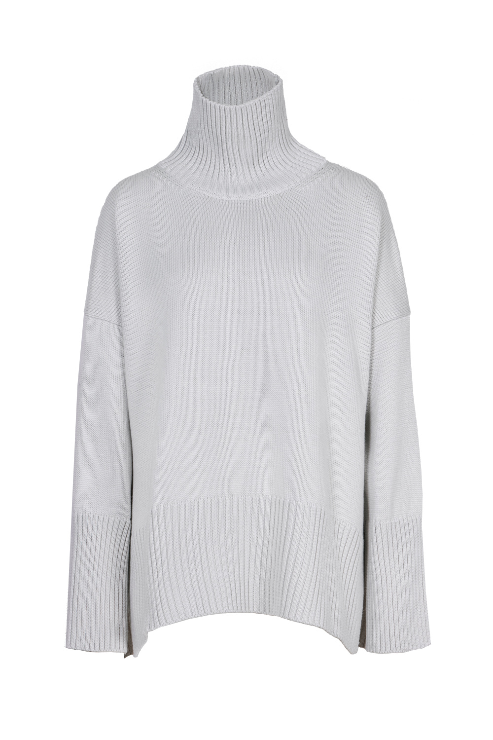 Джемпер оверсайз, со спущенной линией плеча, стойкой и  разрезами по боковым швам. Изделие выполнено из высококачественной шерсти мериноса.
