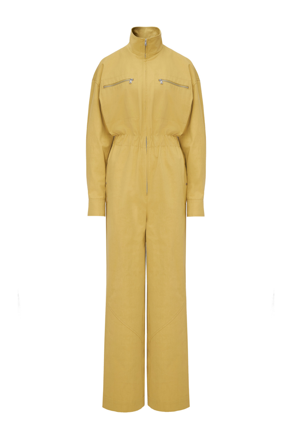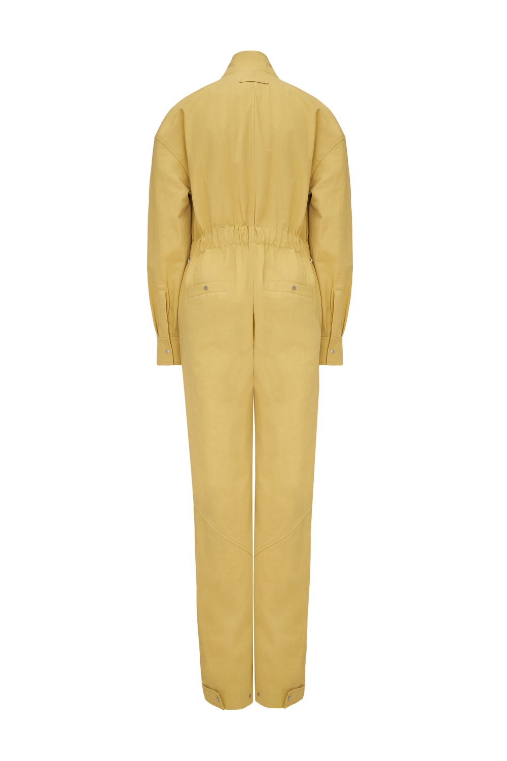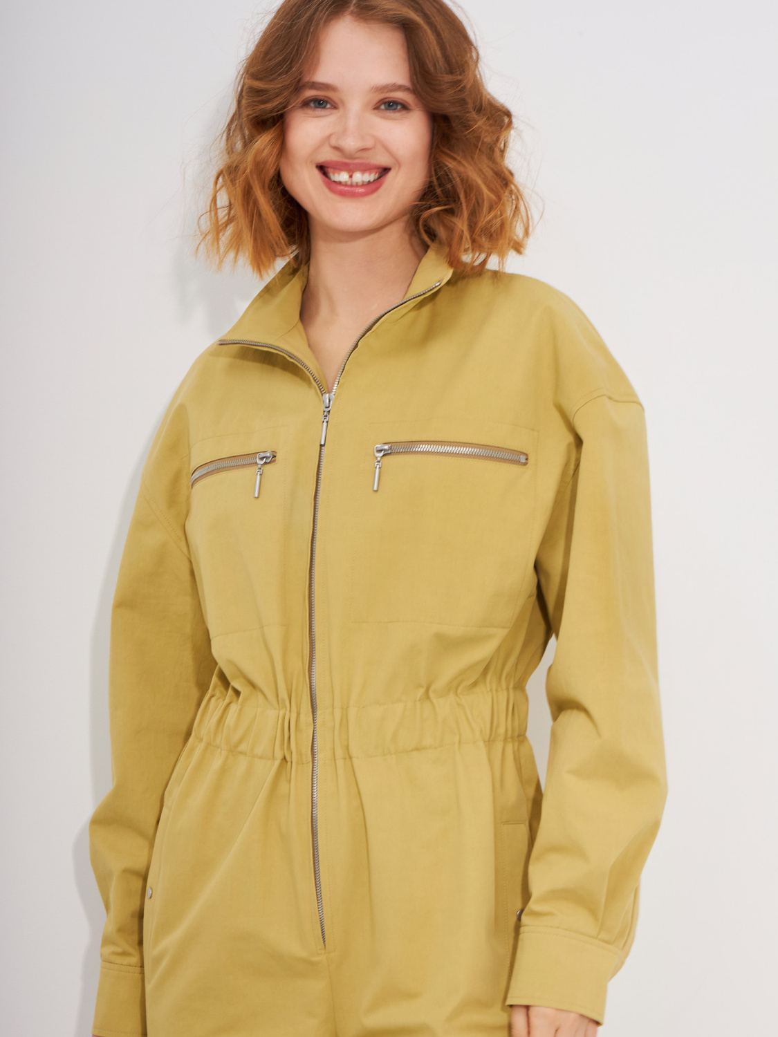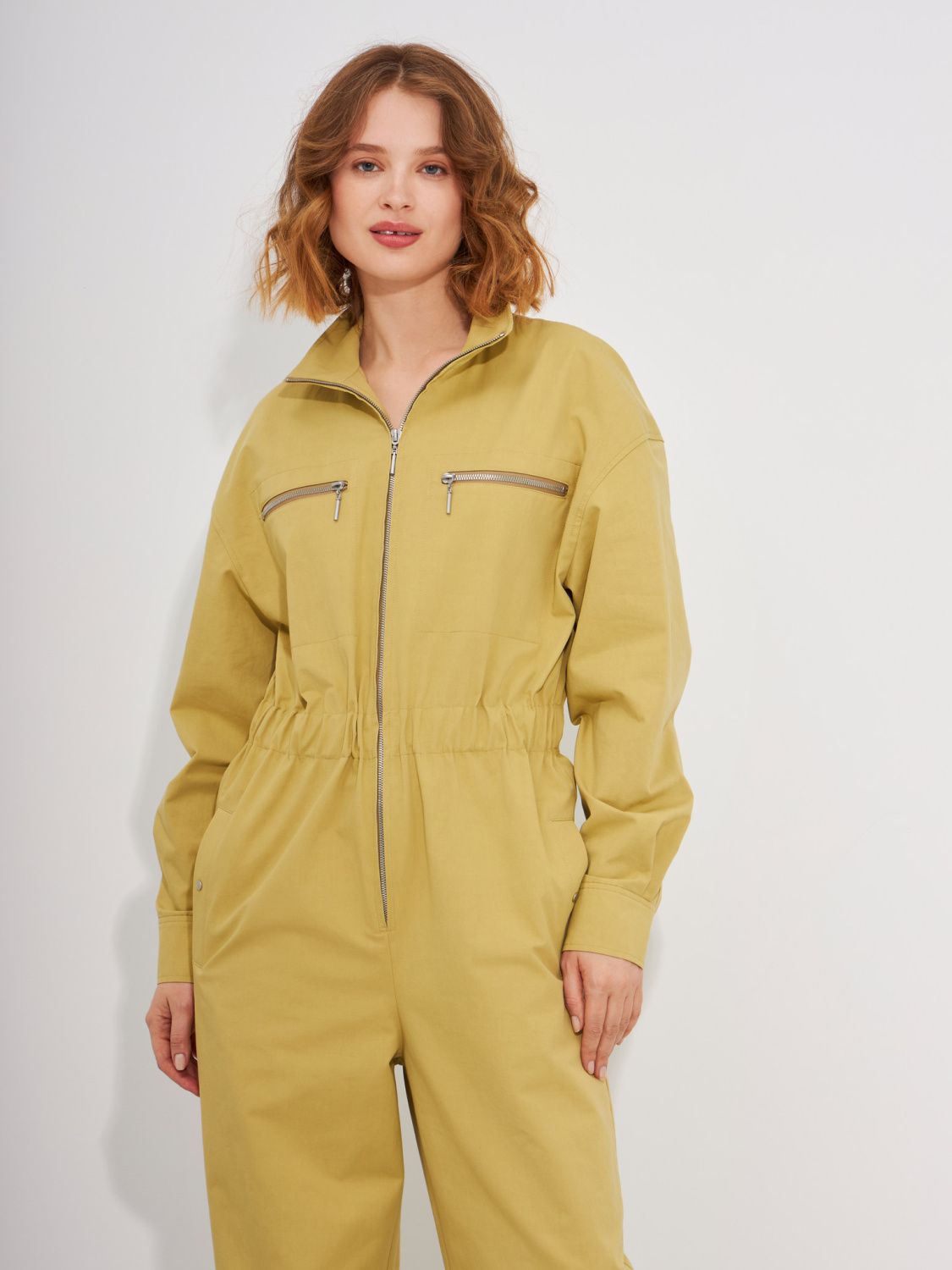 Женский комбинезон с резинкой по линии талии, застёжка на  молнию. Рукава втачные с манжетой, нагрудные карманы застегиваются на молнию.
