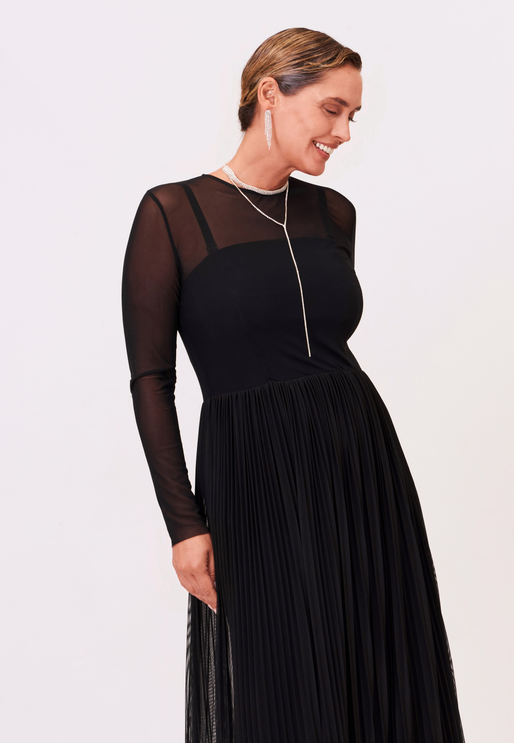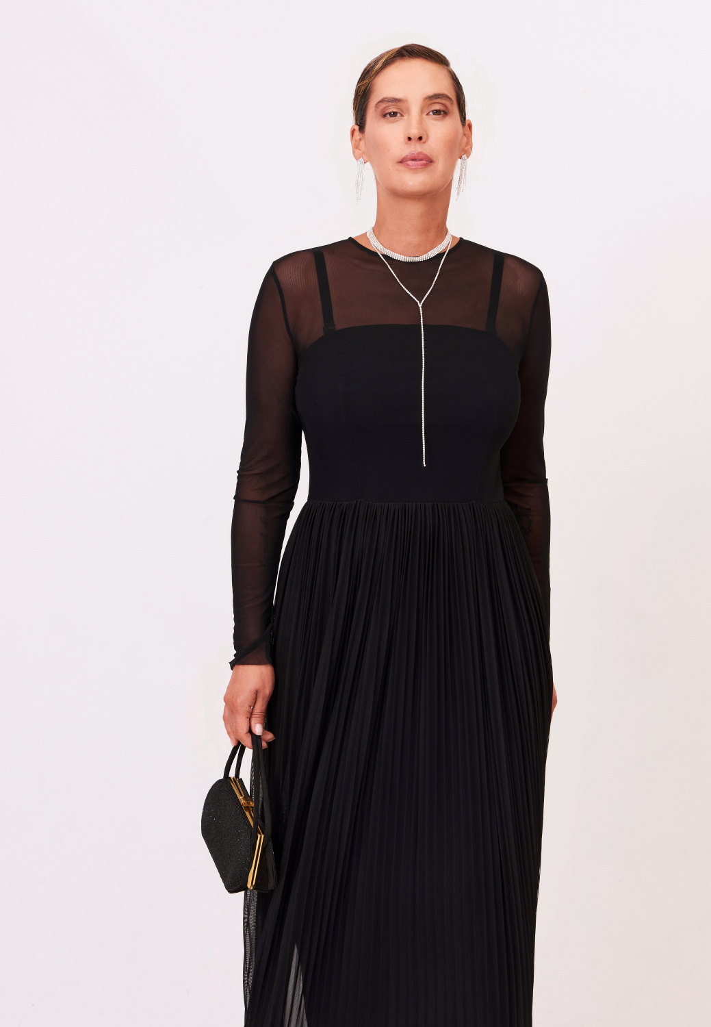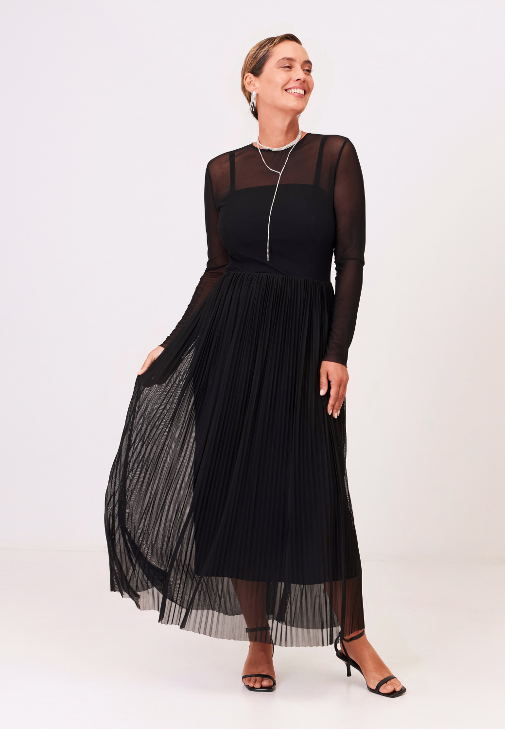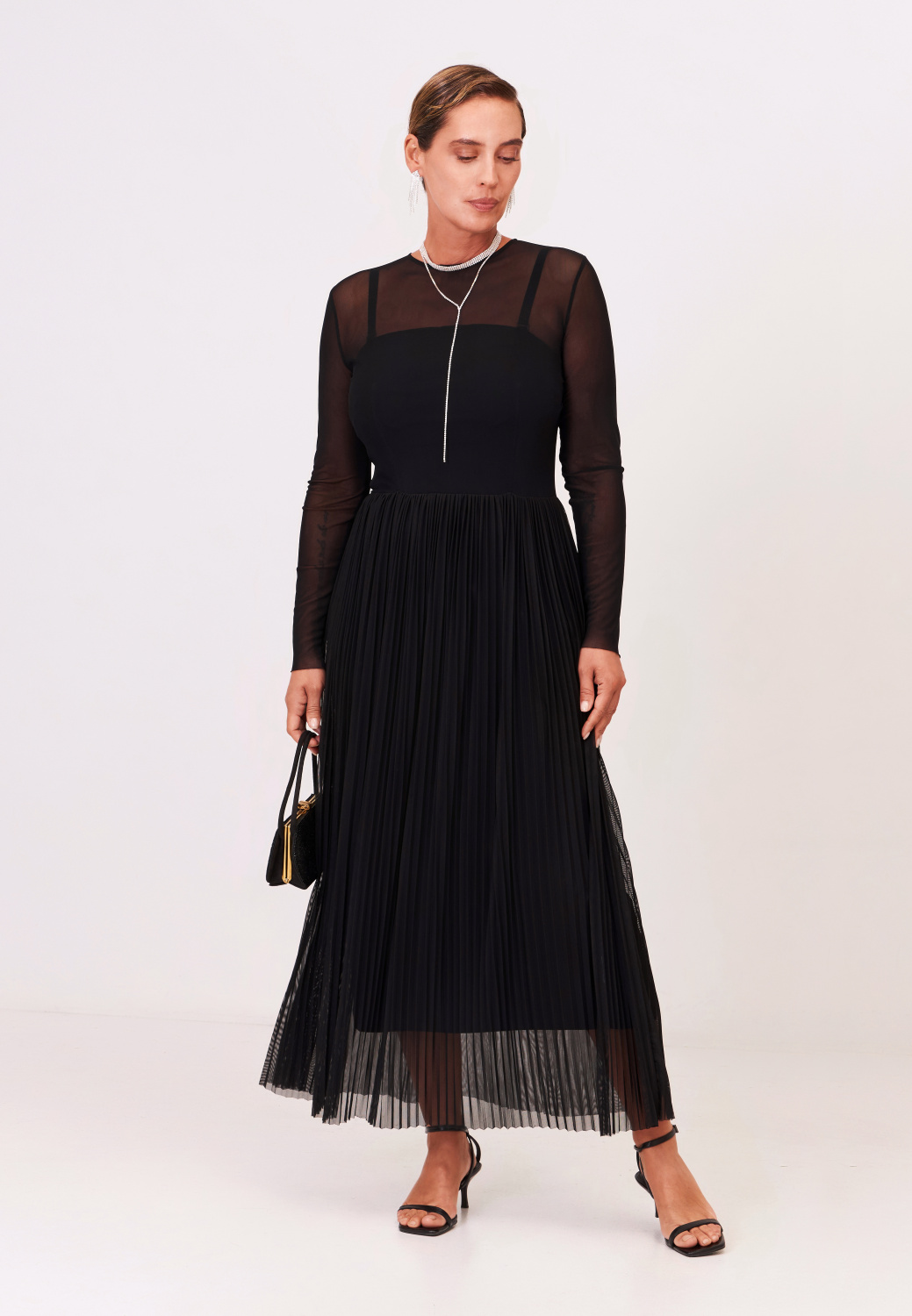 Нарядное воздушное двойное платье из сетки с плиссерованной юбкой станет прекрасным выбором наших покупательниц для своих романтических вечеров и офисных праздников. Полноценное нижнее платье на бретелях из поливискозы, может быть как отдельным элементом Вашего гардероба, так и прекрасно подойдет к прозрачным блузам и топам.