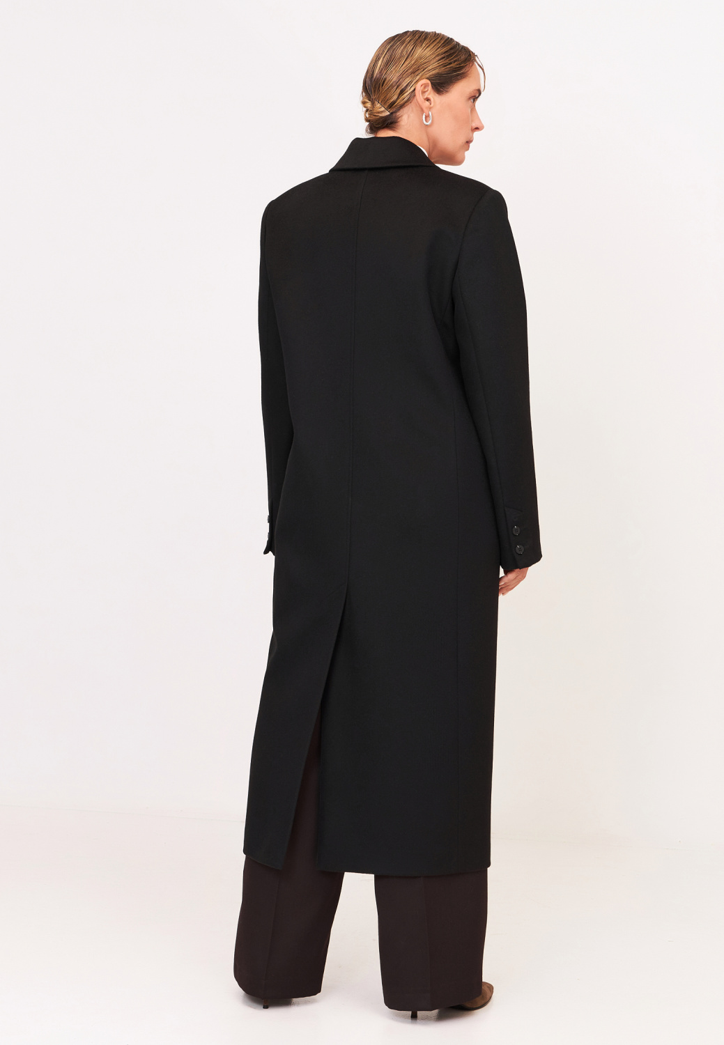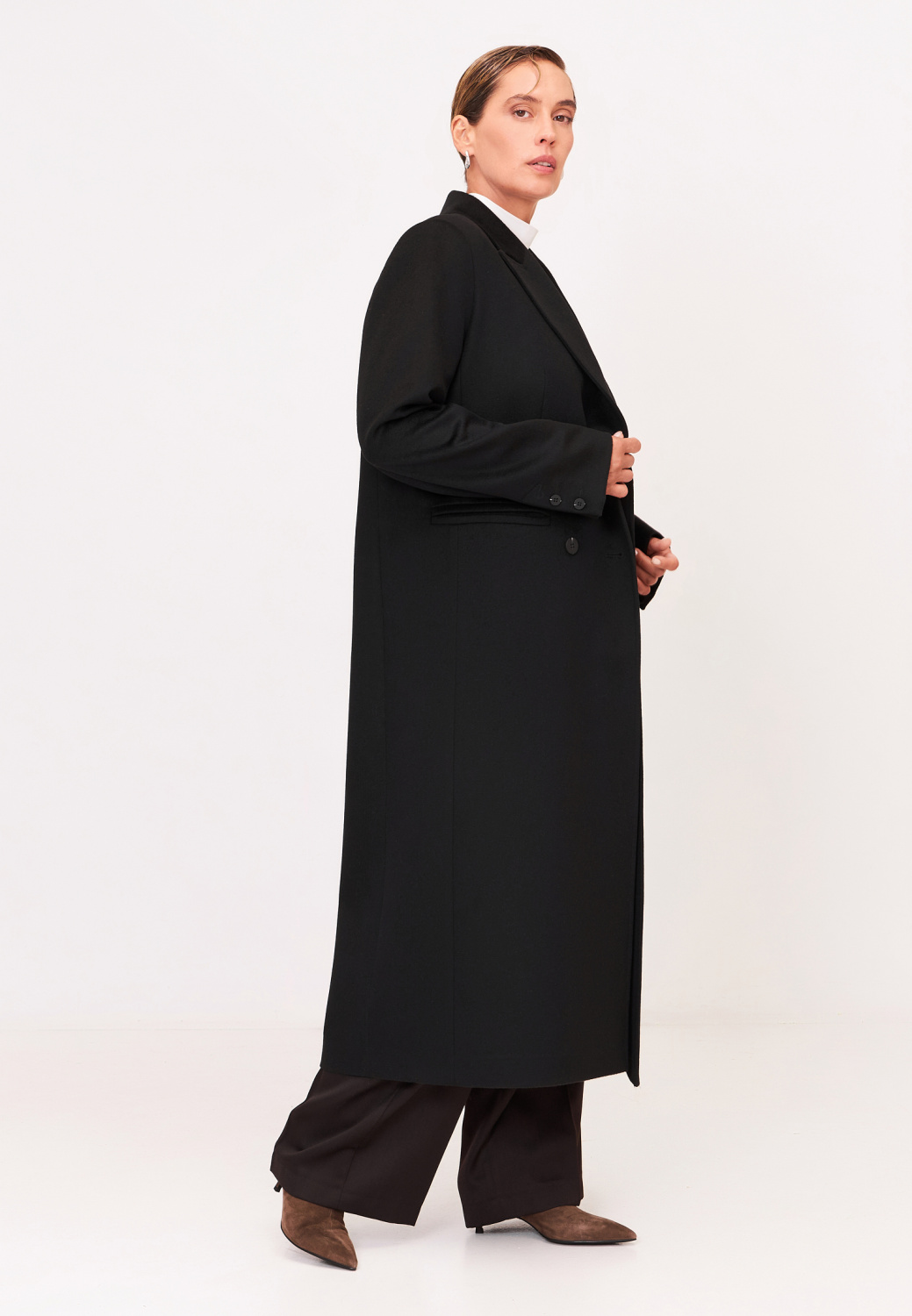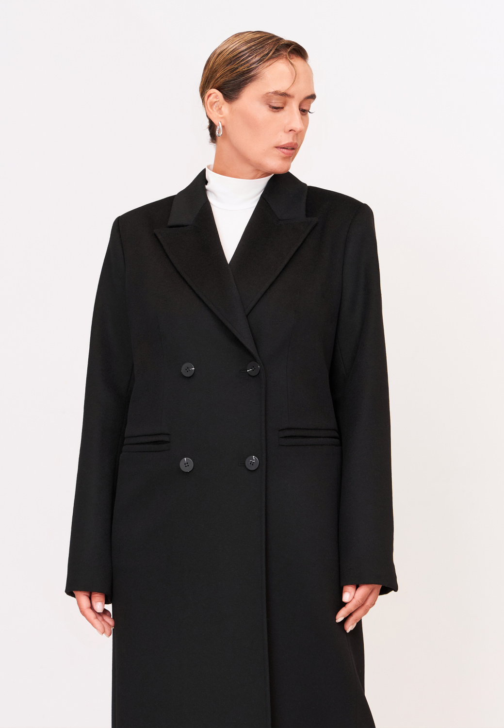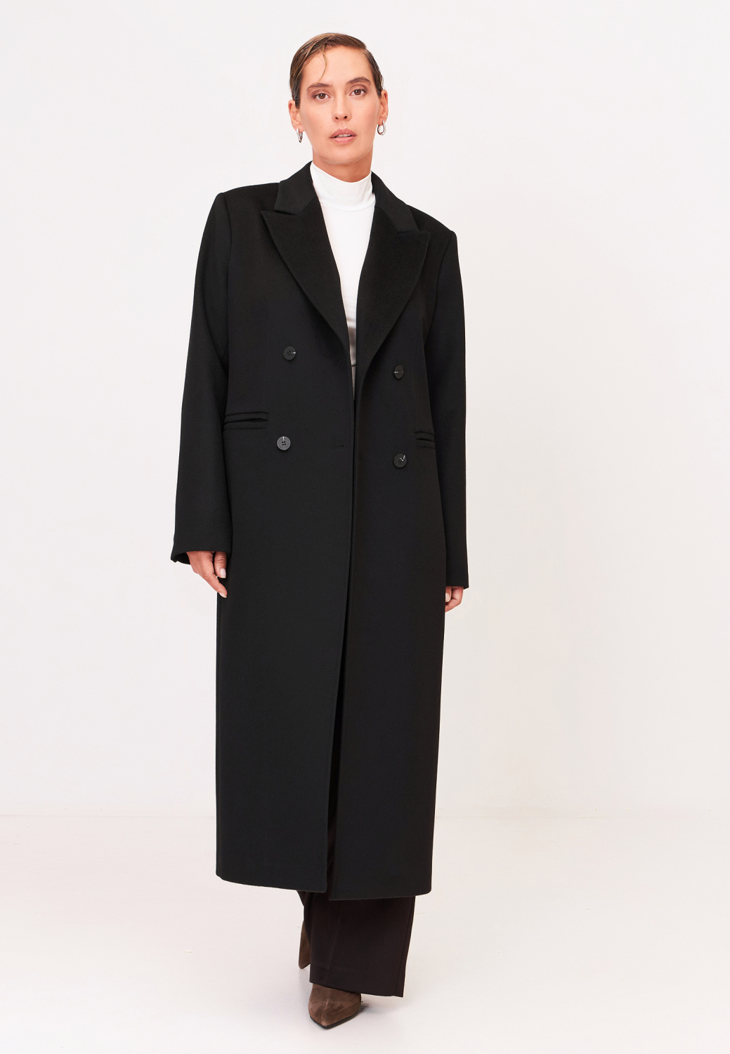 Классическое двубортное пальто в черном цвете сделает любой образ элегантным и стильным. Материал с высоким содержанием шерсти обладает высокой износостойкостью и отлично сохраняет тепло. Данная модель идеально впишется как в формальный, так и в расслабленный образ с элементами спорта.