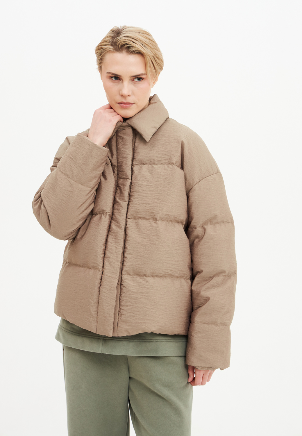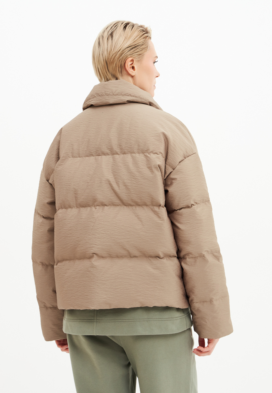 Укороченный пуховик бежевого цвета станет акцентной деталью вашего гардероба. Водотталкивающая ткань с креш эффектом защитит от дождливой и ветренной погоды.