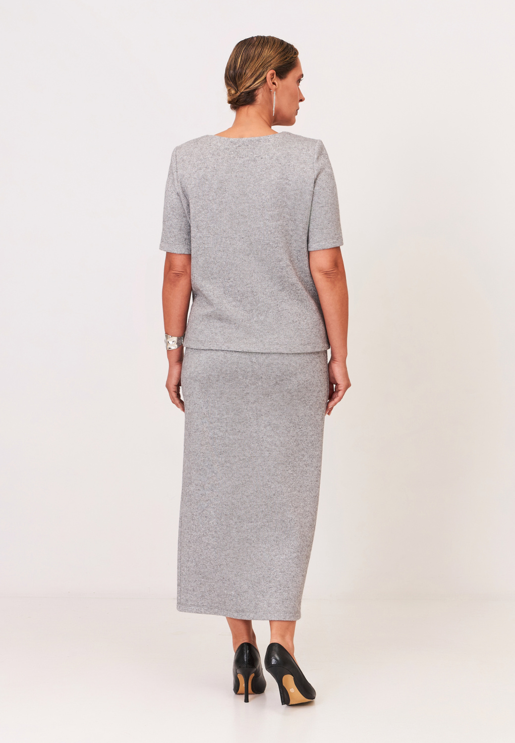 Трикотажная юбка макси прямого силуэта с высоким разрезом  - модель, которую легко встроить и в вечерний, и в повседневный образ. Материал с высоким содержанием вискозы отлично пропускает воздух и приятен к телу, а искусственные волокна делают материал более долговечным и эластичным, что важно для комфортной посадки. Для создания полноценного образа юбку можно сочетать с джемпером из комплекта.