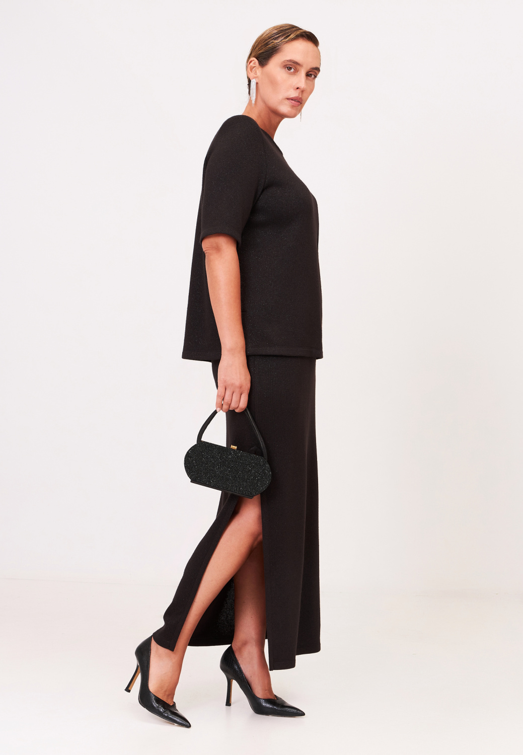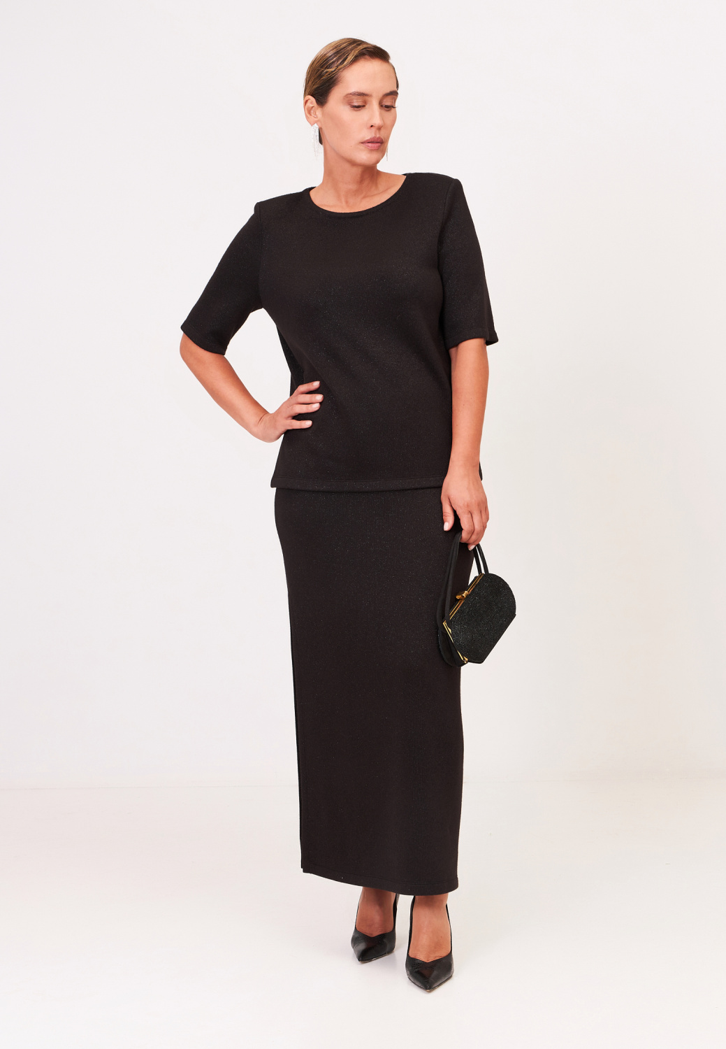 Трикотажная юбка миди прямого силуэта с высоким разрезом - модель, которую легко встроить и в вечерний, и в повседневный образ. Материал с высоким содержанием вискозы отлично пропускает воздух и приятен к телу, а искусственные волокна делают материал более долговечным и эластичным, что важно для комфортной посадки. Для создания полноценного образа юбку можно сочетать с джемпером из комплекта.